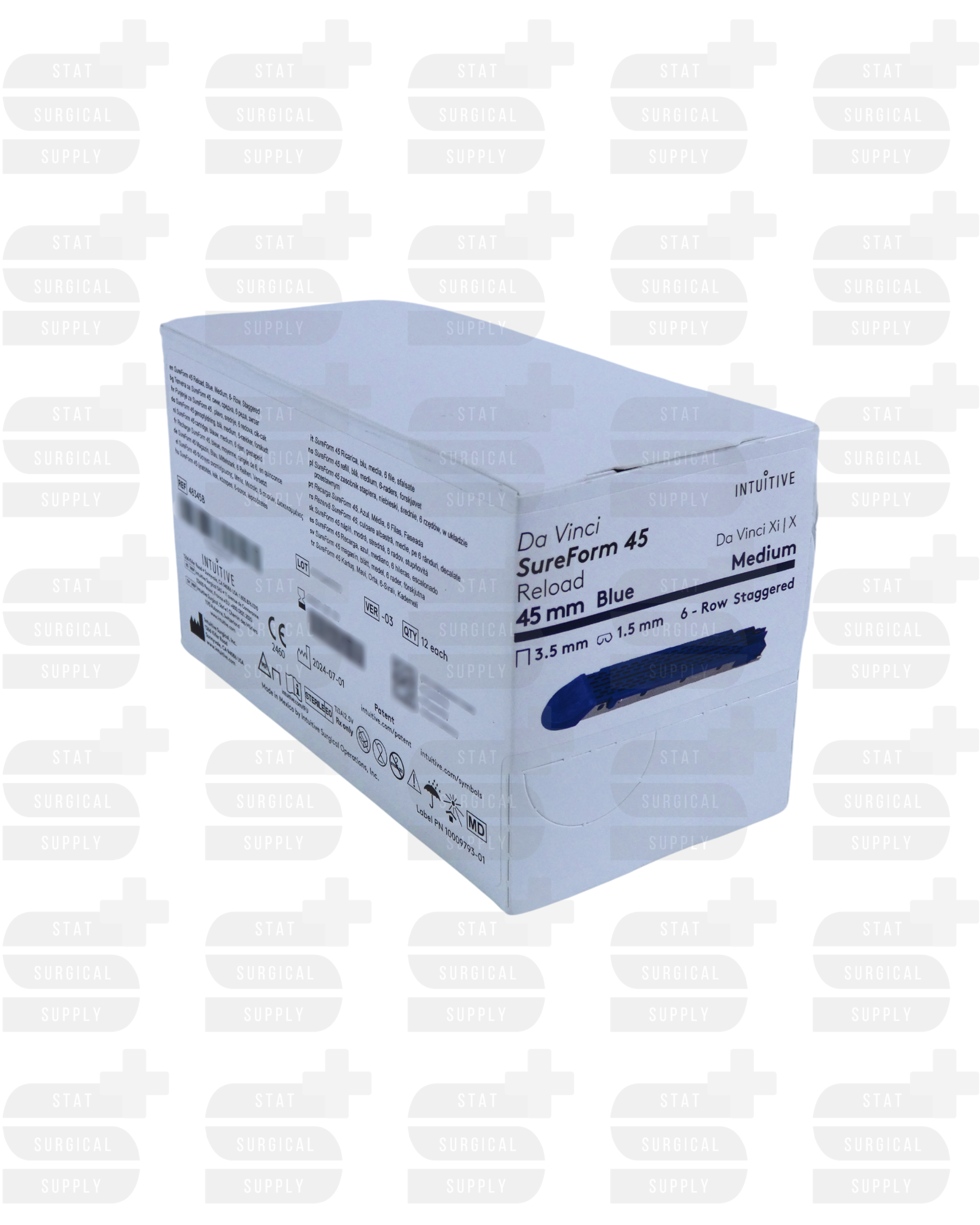 The Intuitive Surgical 48345B SureForm™ 45 Blue Reload is a single-use, sterile stapler cartridge engineered for SureForm™ 45 staplers used with the da Vinci® Xi/X robotic systems. This 3.5 mm reload delivers six precise rows of staples in a single firing, ensuring consistent compression, even cutting, and secure tissue closure.