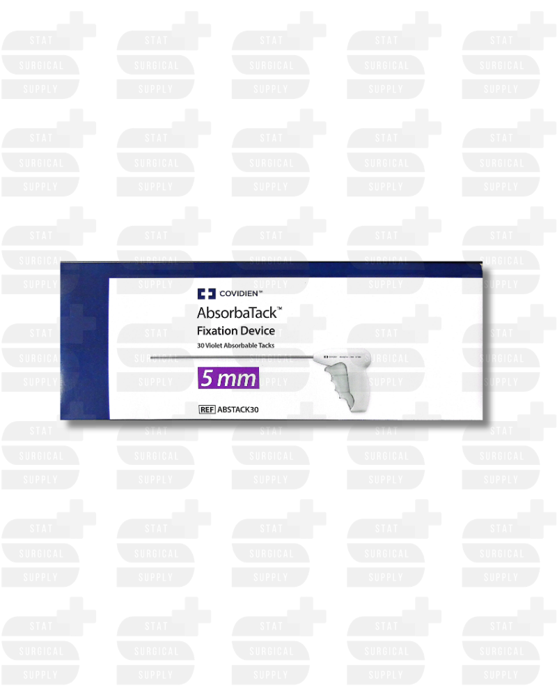 ABSTACK30 Fixation Device, 5 mm Size, 36 cm Shaft Length, 30 Staples Used, Polyester Copolymer Tack, Pistol Grip Handle, Single-Use The Covidien ABSTACK30 AbsorbaTack™ Fixation Device is a sterile, single-use laparoscopic mesh fixation system designed for strong temporary fixation during hernia repair. It features a 5 mm diameter shaft, 36 cm working length, and delivers 30 absorbable polyester-copolymer tacks with consistent deployment. Engineered for enhanced performance, the AbsorbaTack system continues to deploy tacks even when the shaft is flexed over 3 cm, making it suitable for complex anatomical access during minimally invasive hernia procedures. A short version (ABSTACK20S) is available for open repairs.