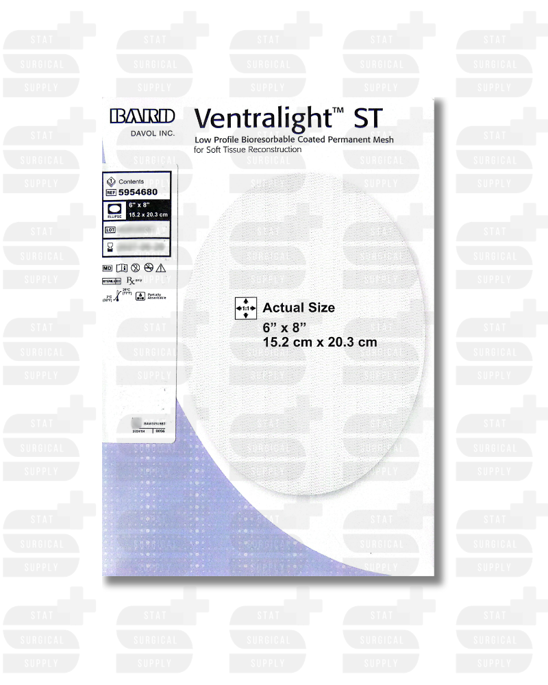 5954680 The Ventralight™ ST Mesh (Part Number 5954680) from BARD is engineered for laparoscopic ventral hernia repair procedures. Measuring 6 × 8 inches in an elliptical configuration, the mesh features a medium-weight monofilament polypropylene construction on the anterior side with an open pore design to support tissue integration. On the posterior side, the mesh incorporates an absorbable hydrogel barrier based on Sepra® technology, designed to minimize direct tissue attachment during the critical healing period. This dual-sided construction supports intra-abdominal placement while facilitating controlled deployment through a trocar.