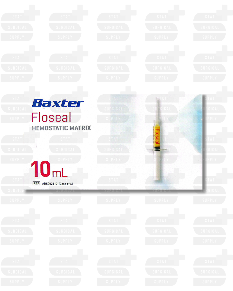 ADS202110 Hemostatic Matrix Kit, 10 mL, Gelatin Matrix + Recombinant Human Thrombin 5000 IU, Includes Standard and Malleable Applicator Tips, Single-Use The Baxter Floseal Hemostatic Matrix (ADS202110) is a sterile, flowable hemostatic agent designed for rapid control of bleeding in a wide range of surgical procedures. This larger 10 mL kit combines a gelatin-based matrix with RECOTHROM® recombinant human thrombin (5000 IU) to achieve fast, reliable clot formation where conventional techniques may be insufficient. The system includes a 10 mL gelatin matrix syringe, a 10 mL saline syringe for preparation, and both standard and malleable applicator tips, ensuring precise placement even in difficult-to-access surgical sites. The needle-free vial adapter supports safe and efficient thrombin reconstitution.
